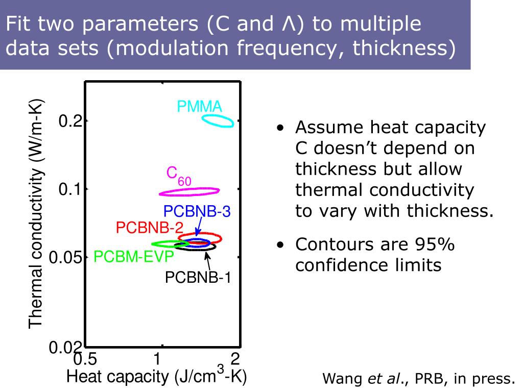 Fit two parameters (C and Λ) to multiple data sets (modulation frequency, thickness) • Assume heat capacity C doesn’t depend on thickness but allow thermal conductivity to vary with thickness. • Contours are 95% confidence limits Wang et al., PRB, in press.