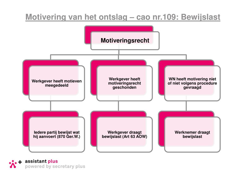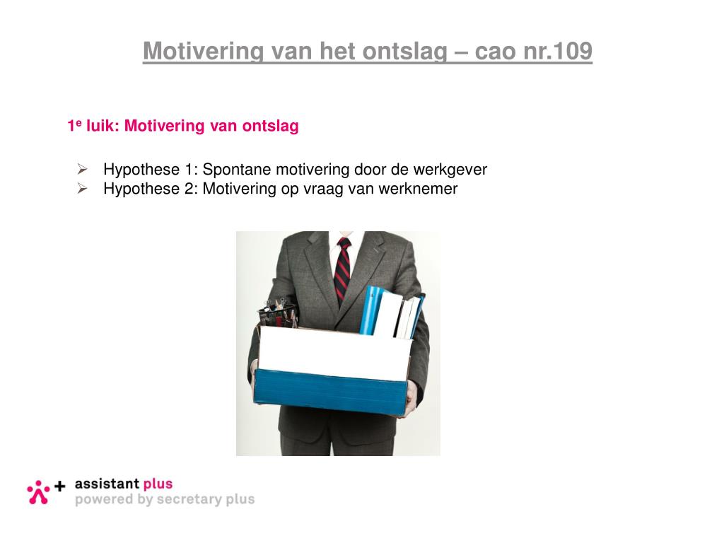 Motivering van het ontslag – cao nr.109 • 1e luik:Motivering van ontslag • Hypothese 1: Spontane motivering door de werkgever • Hypothese 2: Motivering op vraag van werknemer