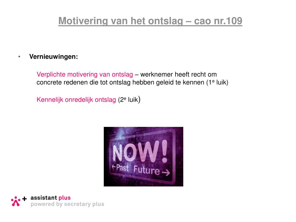 Motivering van het ontslag – cao nr.109 • Vernieuwingen: • Verplichte motivering van ontslag – werknemer heeft recht om • concrete redenen die tot ontslag hebben geleid te kennen (1e luik) • Kennelijk onredelijk ontslag(2e luik)