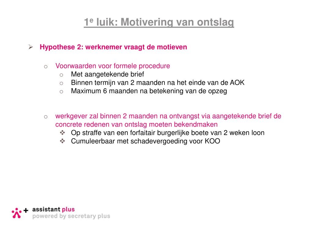 1e luik: Motivering van ontslag • Hypothese 2: werknemer vraagt de motieven • Voorwaarden voor formele procedure • Met aangetekende brief • Binnen termijn van 2 maanden na het einde van de AOK • Maximum 6 maanden na betekening van de opzeg • werkgever zal binnen 2 maanden na ontvangst via aangetekende brief de concrete redenen van ontslag moeten bekendmaken • Op straffe van een forfaitair burgerlijke boete van 2 weken loon • Cumuleerbaar met schadevergoeding voor KOO
