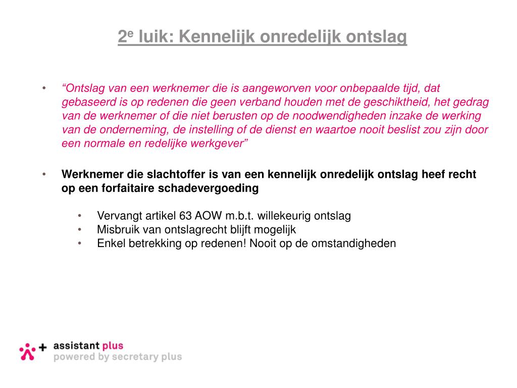 2e luik: Kennelijk onredelijk ontslag • “Ontslag van een werknemer die is aangeworven voor onbepaalde tijd, dat gebaseerd is op redenen die geen verband houden met de geschiktheid, het gedrag van de werknemer of die niet berusten op de noodwendigheden inzake de werking van de onderneming, de instelling of de dienst en waartoe nooit beslist zou zijn door een normale en redelijke werkgever” • Werknemer die slachtoffer is van een kennelijk onredelijk ontslag heef recht op een forfaitaire schadevergoeding • Vervangt artikel 63 AOW m.b.t. willekeurig ontslag • Misbruik van ontslagrecht blijft mogelijk • Enkel betrekking op redenen! Nooit op de omstandigheden