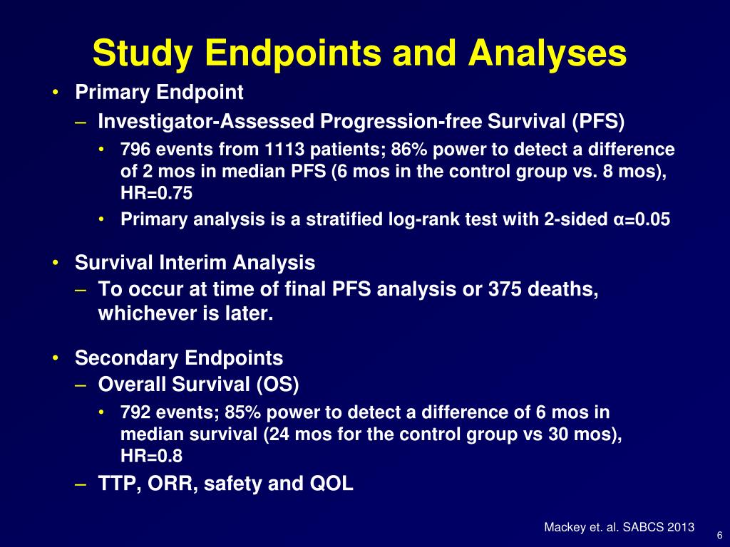 Study Endpoints and Analyses • Primary Endpoint • Investigator-Assessed Progression-free Survival (PFS) • 796 eventsfrom 1113 patients; 86% power to detect a difference of 2 mos in median PFS (6 mos in the control group vs. 8 mos), HR=0.75 • Primary analysis is a stratified log-rank test with 2-sided α=0.05 • Survival Interim Analysis • To occur at time of final PFS analysis or 375 deaths, whichever is later. • Secondary Endpoints • Overall Survival (OS) • 792 events; 85% power to detect a difference of 6 mosin median survival (24 mosfor the control group vs 30 mos), HR=0.8 • TTP, ORR, safety and QOL