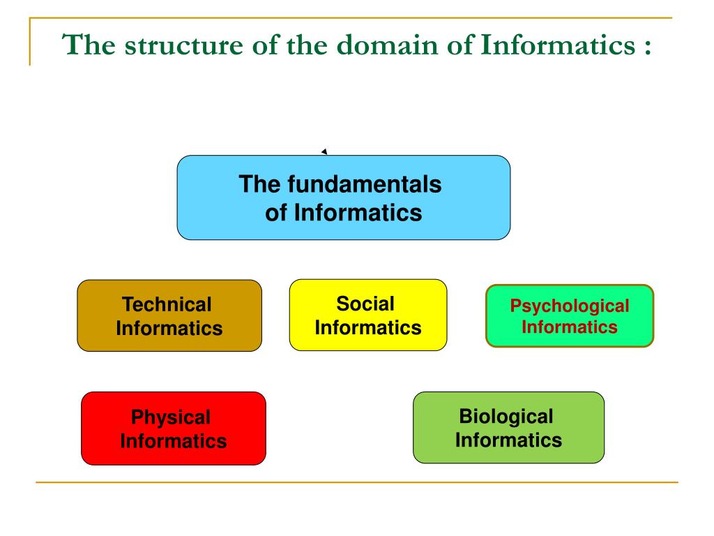 The structure of the domain of Informatics : The fundamentals of Informatics Social Informatics Technical Informatics Psychological Informatics Physical Informatics Biological Informatics