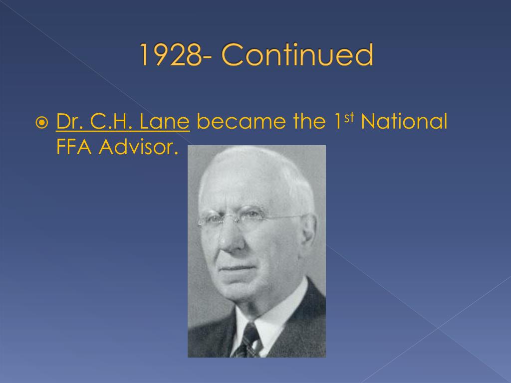 1928- Continued Dr. C.H. Lane became the 1st National FFA Advisor.