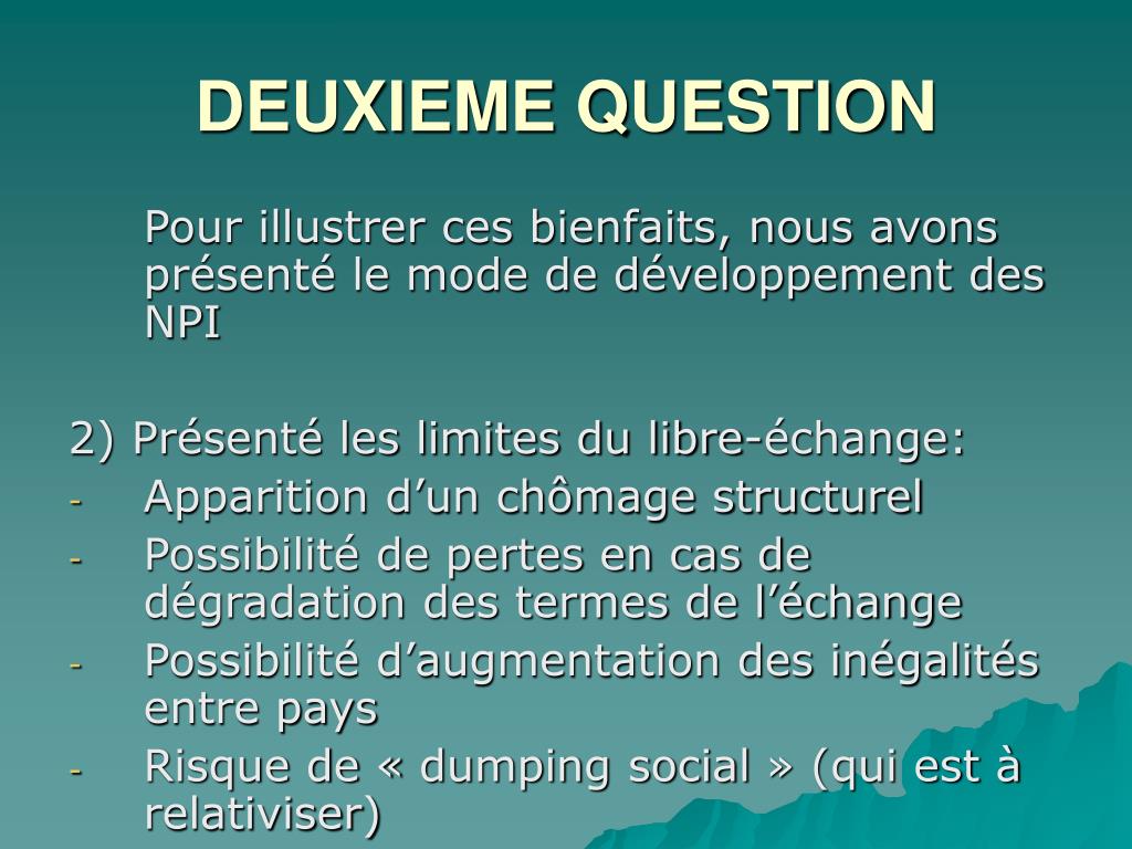 DEUXIEME QUESTION Pour illustrer ces bienfaits, nous avons présenté le mode de développement des NPI 2) Présenté les limites du libre-échange: • Apparition d’un chômage structurel • Possibilité de pertes en cas de dégradation des termes de l’échange • Possibilité d’augmentation des inégalités entre pays • Risque de « dumping social » (qui est à relativiser)