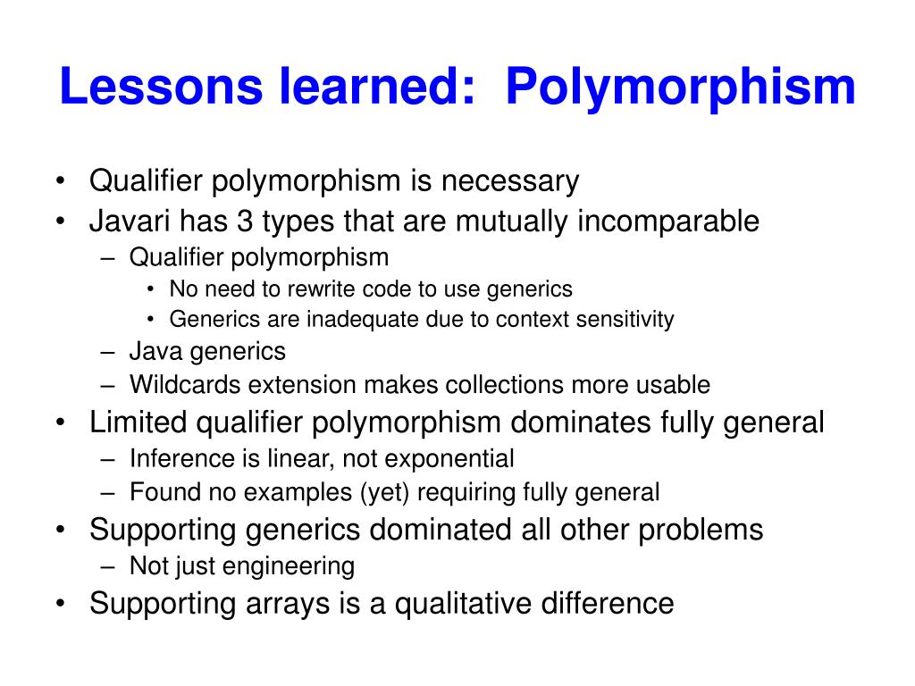 Lessons learned: Polymorphism • Qualifier polymorphism is necessary • Javari has 3 types that are mutually incomparable • Qualifier polymorphism • No need to rewrite code to use generics • Generics are inadequate due to context sensitivity • Java generics • Wildcards extension makes collections more usable • Limited qualifier polymorphism dominates fully general • Inference is linear, not exponential • Found no examples (yet) requiring fully general • Supporting generics dominated all other problems • Not just engineering • Supporting arrays is a qualitative difference
