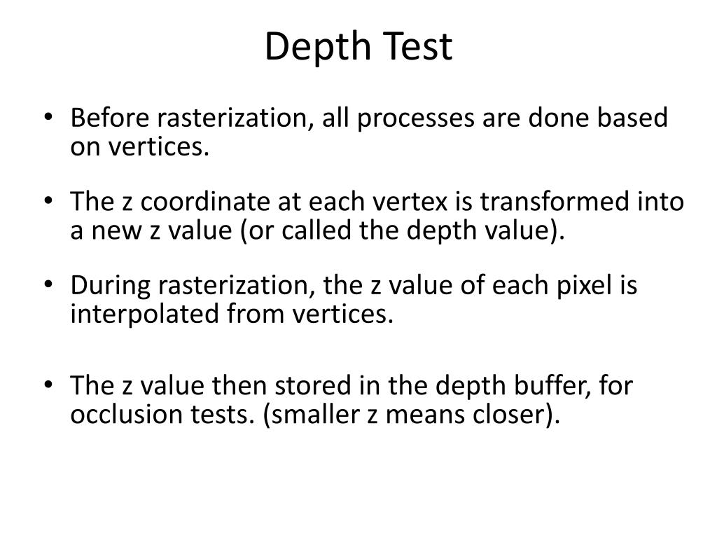 Depth Test • Before rasterization, all processes are done based on vertices. • The z coordinate at each vertex is transformed into a new z value (or called the depth value). • During rasterization, the z value of each pixel is interpolated from vertices. • The z value then stored in the depth buffer, for occlusion tests. (smaller z means closer).