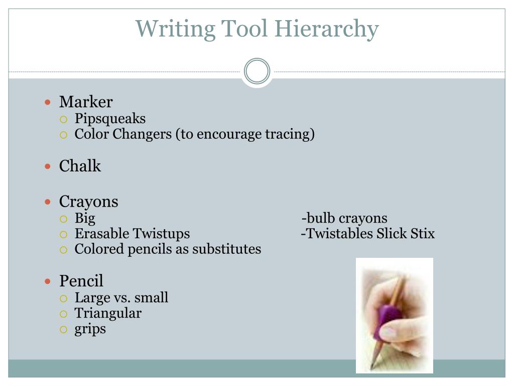 Writing Tool Hierarchy Marker Pipsqueaks Color Changers (to encourage tracing) Chalk Crayons Big -bulb crayons Erasable Twistups -Twistables Slick Stix Colored pencils as substitutes Pencil Large vs. small Triangular grips