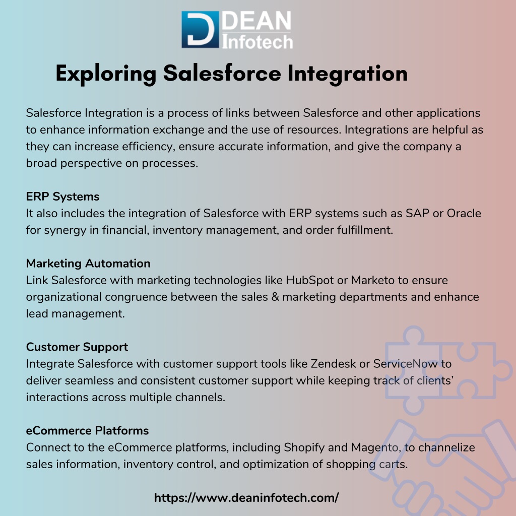 Exploring Salesforce Integration Salesforce Integration is a process of links between Salesforce and other applications to enhance information exchange and the use of resources. Integrations are helpful as they can increase efficiency, ensure accurate information, and give the company a broad perspective on processes. ERP Systems It also includes the integration of Salesforce with ERP systems such as SAP or Oracle for synergy in financial, inventory management, and order fulfillment. Marketing Automation Link Salesforce with marketing technologies like HubSpot or Marketo to ensure organizational congruence between the sales & marketing departments and enhance lead management. Customer Support Integrate Salesforce with customer support tools like Zendesk or ServiceNow to deliver seamless and consistent customer support while keeping track of clients’ interactions across multiple channels. eCommerce Platforms Connect to the eCommerce platforms, including Shopify and Magento, to channelize sales information, inventory control, and optimization of shopping carts. https://www.deaninfotech.com/