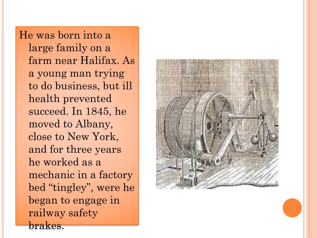 He was born into a large family on a farm near Halifax. As a young man trying to do business, but ill health prevented succeed. In 1845, he moved to Albany, close to New York, and for three years he worked as a mechanic in a factory bed “tingley”, were he began to engage in railway safety brakes.