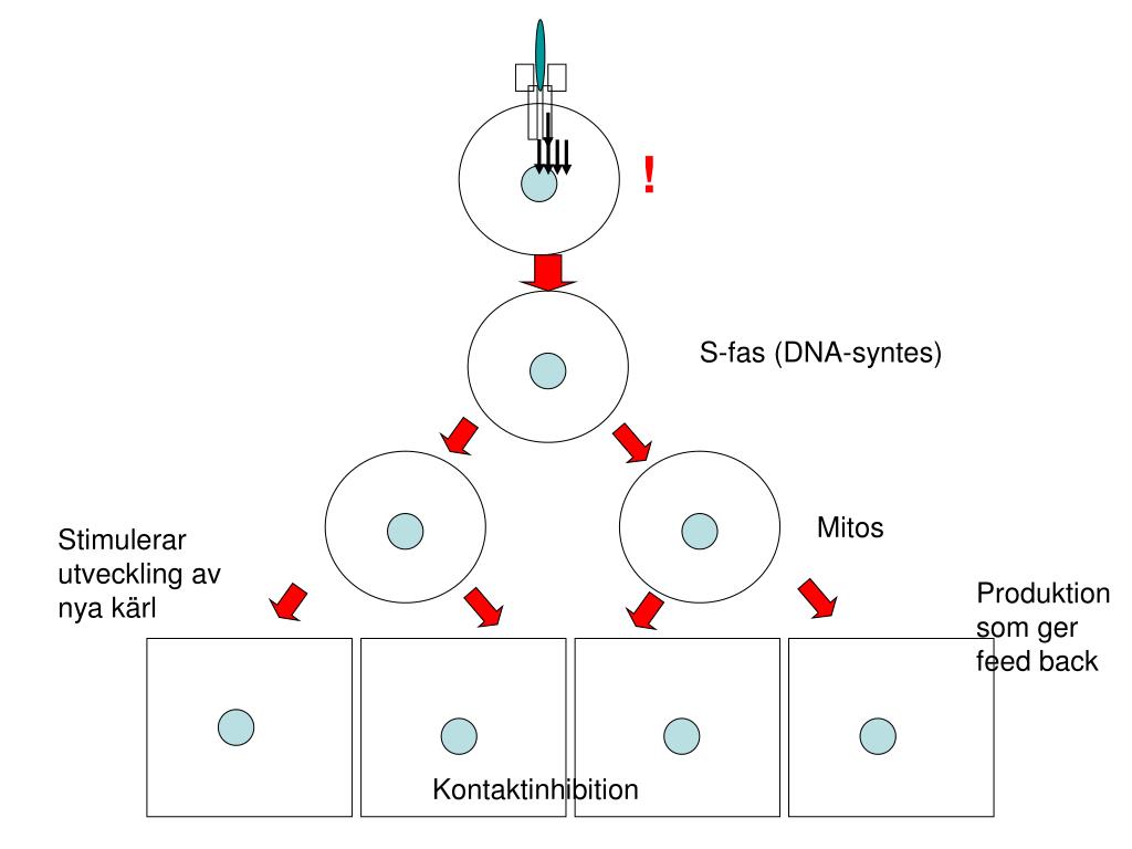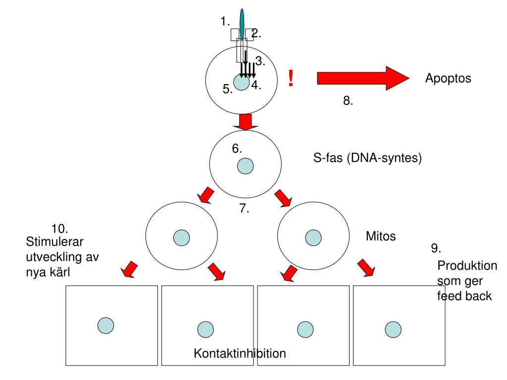 1. 2. 3. ! Apoptos 4. 5. 8. 6. S-fas (DNA-syntes) 7. 10. Mitos Stimulerar utveckling av nya kärl 9. Produktion som ger feed back Kontaktinhibition