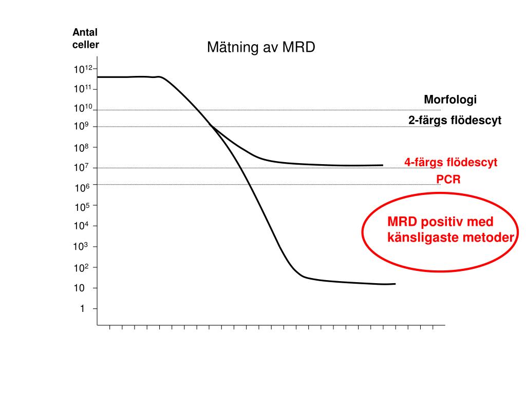 Antal celler Mätning av MRD 1012 1011 Morfologi 1010 2-färgs flödescyt 109 108 4-färgs flödescyt 107 PCR 106 105 MRD positiv med känsligaste metoder 104 103 102 10 1