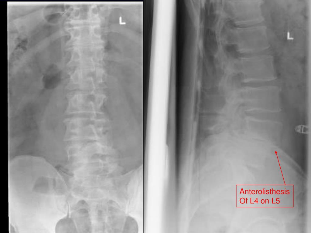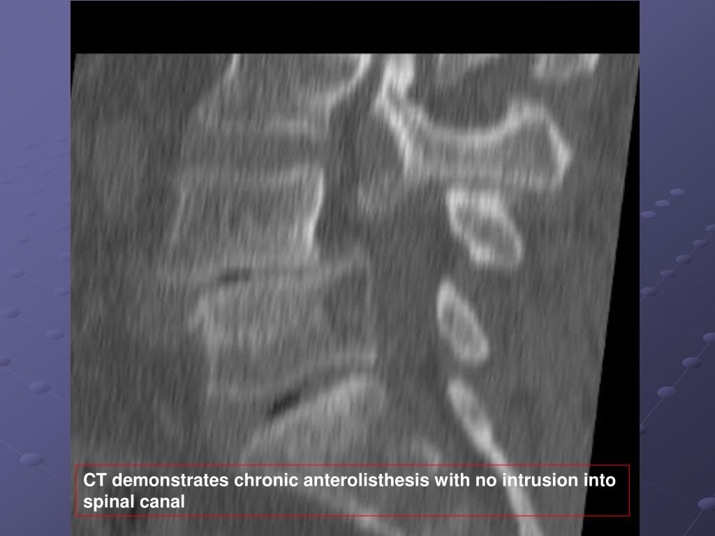 CT demonstrates chronic anterolisthesis with no intrusion into spinal canal