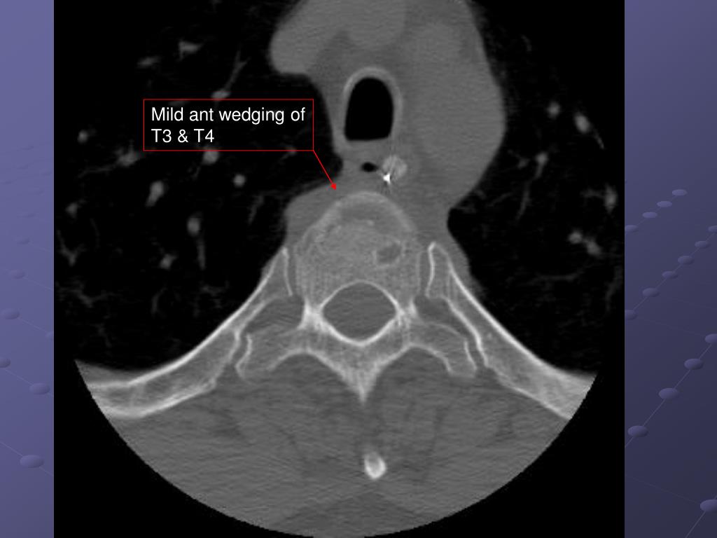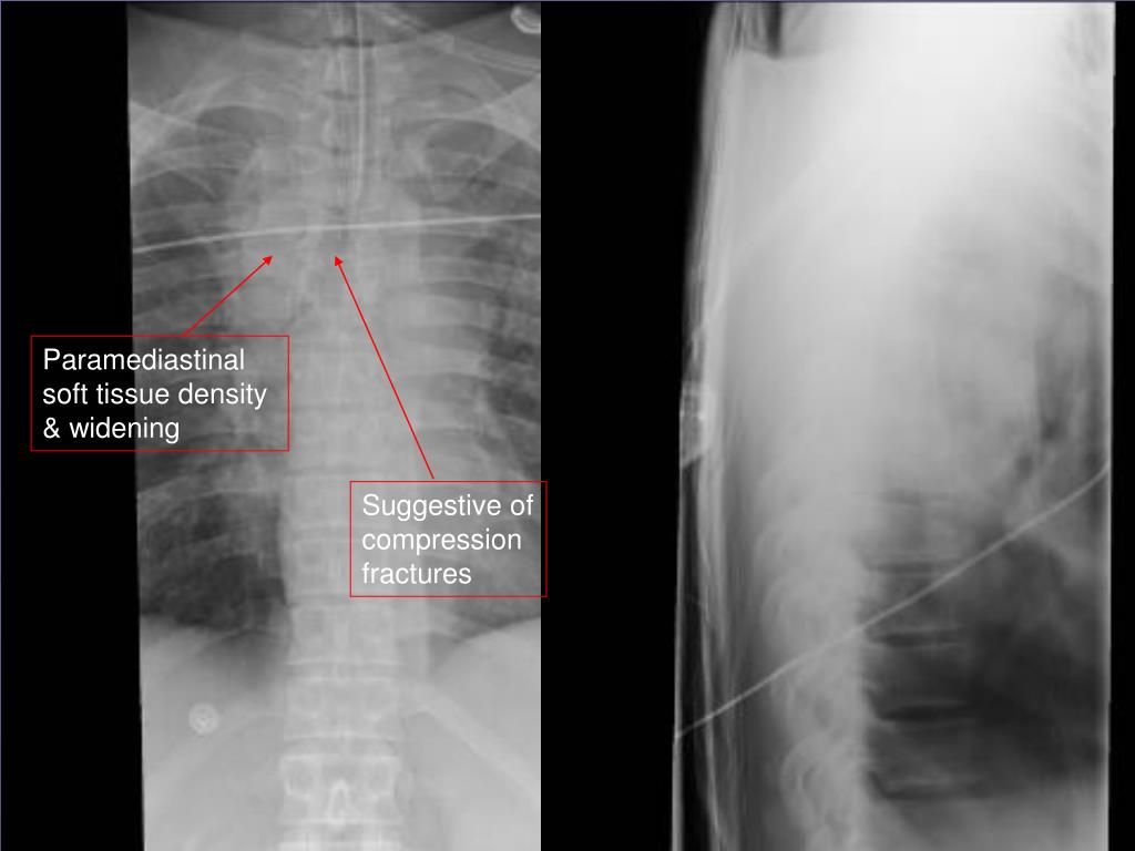 Widened paraspinal line suggesting hematoma Laterally displaced T5 pedicle Anterior wedging of T4 & T5 w/ loss of 30-40% of body ht