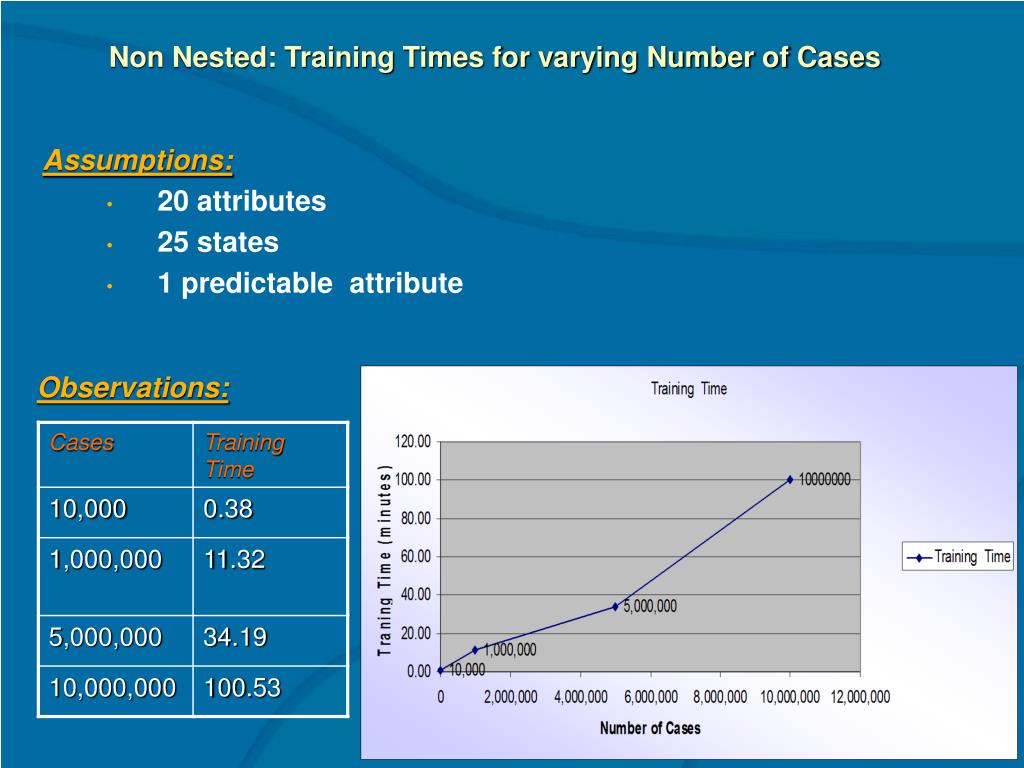 Non Nested: Training Times for varying Number of Cases • Assumptions: • 20 attributes • 25 states • 1 predictable attribute Observations:
