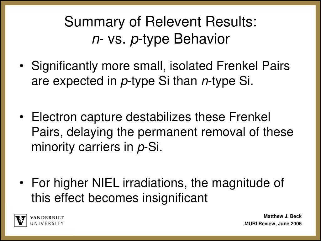Summary of Relevent Results:n- vs. p-type Behavior • Significantly more small, isolated Frenkel Pairs are expected in p-type Si than n-type Si. • Electron capture destabilizes these Frenkel Pairs, delaying the permanent removal of these minority carriers in p-Si. • For higher NIEL irradiations, the magnitude of this effect becomes insignificant