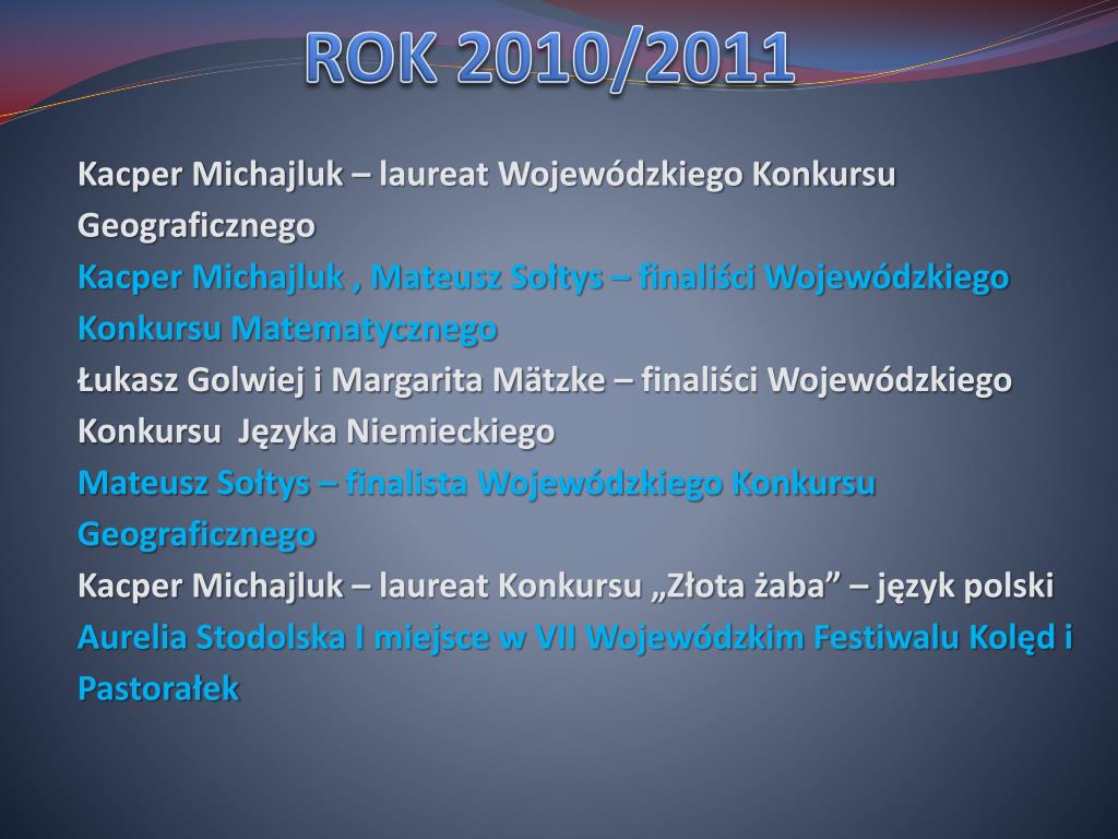 Kacper Michajluk – laureat Wojewódzkiego Konkursu Geograficznego Kacper Michajluk , Mateusz Sołtys – finaliści Wojewódzkiego Konkursu Matematycznego Łukasz Golwiej i Margarita Mätzke – finaliści Wojewódzkiego Konkursu Języka Niemieckiego Mateusz Sołtys – finalista Wojewódzkiego Konkursu Geograficznego Kacper Michajluk – laureat Konkursu „Złota żaba” – język polski Aurelia Stodolska I miejsce w VII Wojewódzkim Festiwalu Kolęd i Pastorałek ROK 2010/2011