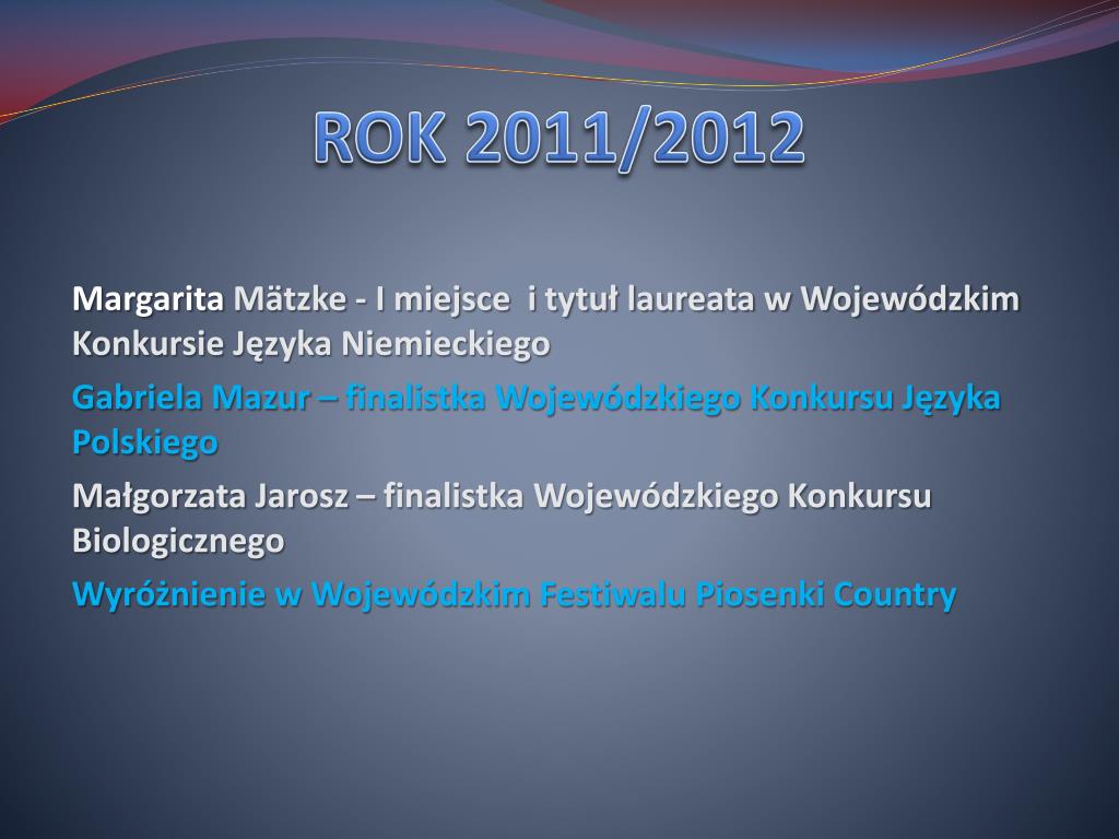 ROK 2011/2012 Margarita Mätzke - I miejsce i tytuł laureata w Wojewódzkim Konkursie Języka Niemieckiego Gabriela Mazur – finalistka Wojewódzkiego Konkursu Języka Polskiego Małgorzata Jarosz – finalistka Wojewódzkiego Konkursu Biologicznego Wyróżnienie w Wojewódzkim Festiwalu Piosenki Country