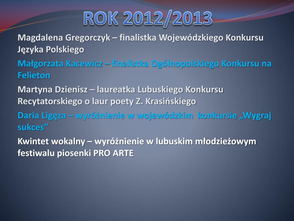 ROK 2012/2013 Magdalena Gregorczyk – finalistka Wojewódzkiego Konkursu Języka Polskiego Małgorzata Kacewicz – finalistka Ogólnopolskiego Konkursu na Felieton Martyna Dzienisz – laureatka Lubuskiego Konkursu Recytatorskiego o laur poety Z. Krasińskiego Daria Ligęza – wyróżnienie w wojewódzkim konkursie „Wygraj sukces” Kwintet wokalny – wyróżnienie w lubuskim młodzieżowym festiwalu piosenki PRO ARTE