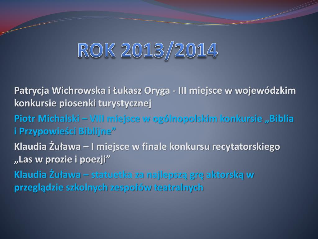 ROK 2013/2014 Patrycja Wichrowska i Łukasz Oryga - III miejsce w wojewódzkim konkursie piosenki turystycznej Piotr Michalski – VIII miejsce w ogólnopolskim konkursie „Biblia i Przypowieści Biblijne” Klaudia Żuława – I miejsce w finale konkursu recytatorskiego „Las w prozie i poezji” Klaudia Żuława – statuetka za najlepszą grę aktorską w przeglądzie szkolnych zespołów teatralnych