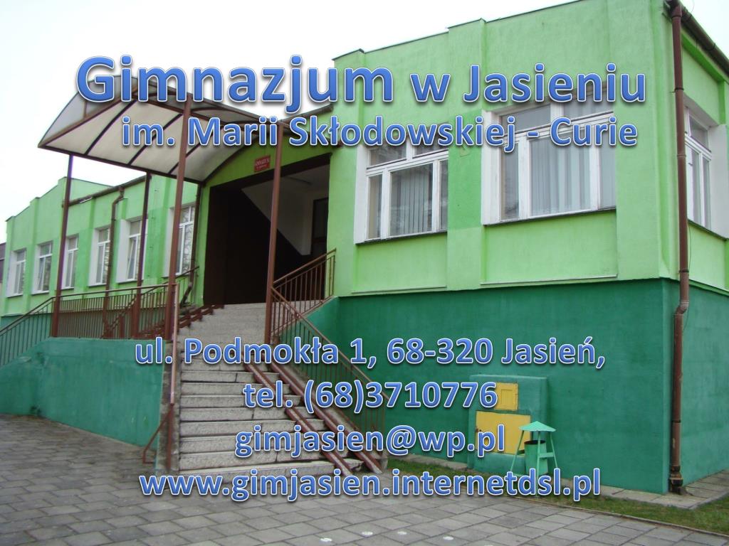 Gimnazjum w Jasieniu im. Marii Skłodowskiej - Curie ul. Podmokła 1, 68-320 Jasień, tel. (68)3710776 gimjasien@wp.pl www.gimjasien.internetdsl.pl