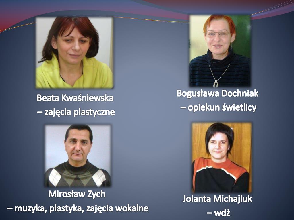 Bogusława Dochniak – opiekun świetlicy Beata Kwaśniewska – zajęcia plastyczne Mirosław Zych – muzyka, plastyka, zajęcia wokalne Jolanta Michajluk – wdż