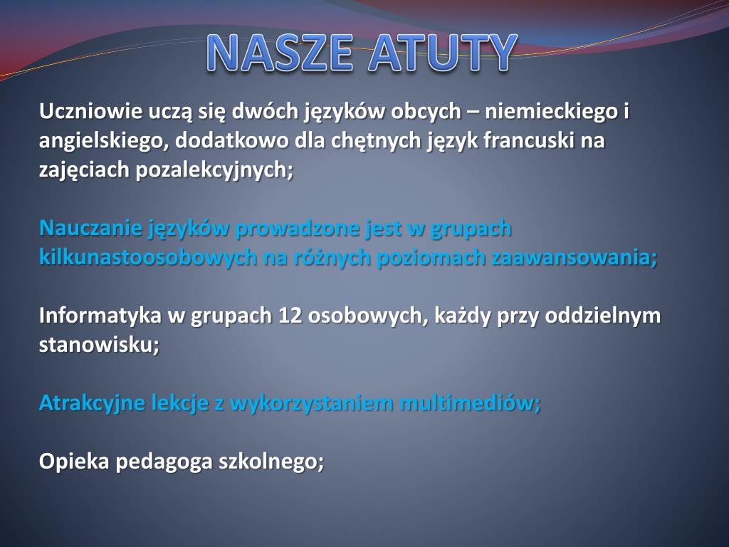 NASZE ATUTY • Uczniowie uczą się dwóch języków obcych – niemieckiego i angielskiego, dodatkowo dla chętnych język francuski na zajęciach pozalekcyjnych; • Nauczanie języków prowadzone jest w grupach kilkunastoosobowych na różnych poziomach zaawansowania; • Informatyka w grupach 12 osobowych, każdy przy oddzielnym stanowisku; • Atrakcyjne lekcje z wykorzystaniem multimediów; • Opieka pedagoga szkolnego;