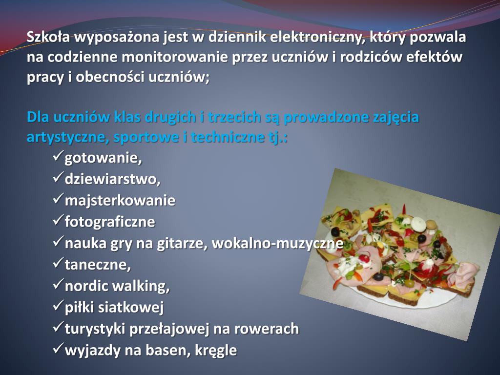 Szkoła wyposażona jest w dziennik elektroniczny, który pozwala na codzienne monitorowanie przez uczniów i rodziców efektów pracy i obecności uczniów; • Dla uczniów klas drugich i trzecich są prowadzone zajęcia artystyczne,sportowe i techniczne tj.: • gotowanie, • dziewiarstwo, • majsterkowanie • fotograficzne • nauka gry na gitarze, wokalno-muzyczne • taneczne, • nordic walking, • piłki siatkowej • turystyki przełajowej na rowerach • wyjazdy na basen, kręgle