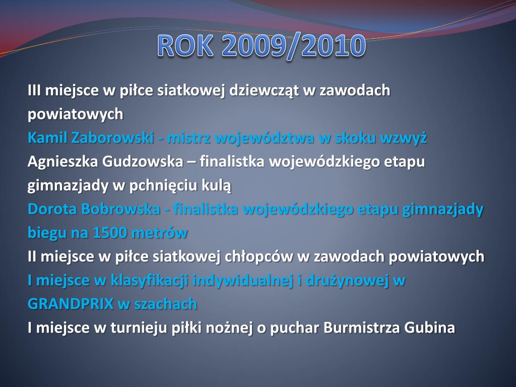 ROK 2009/2010 III miejsce w piłce siatkowej dziewcząt w zawodach powiatowych Kamil Zaborowski - mistrz województwa w skoku wzwyż Agnieszka Gudzowska – finalistka wojewódzkiego etapu gimnazjady w pchnięciu kulą Dorota Bobrowska - finalistka wojewódzkiego etapu gimnazjady biegu na 1500 metrów II miejsce w piłce siatkowej chłopców w zawodach powiatowych I miejsce w klasyfikacji indywidualnej i drużynowej w GRANDPRIX w szachach I miejsce w turnieju piłki nożnej o puchar Burmistrza Gubina