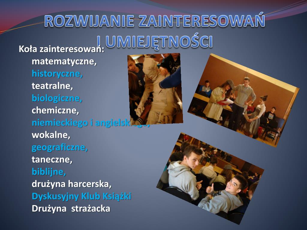 ROZWIJANIE ZAINTERESOWAŃ I UMIEJĘTNOŚCI • Koła zainteresowań: • matematyczne, • historyczne, • teatralne, • biologiczne, • chemiczne, • niemieckiego i angielskiego, • wokalne, • geograficzne, • taneczne, • biblijne, • drużyna harcerska, • Dyskusyjny Klub Książki • Drużyna strażacka