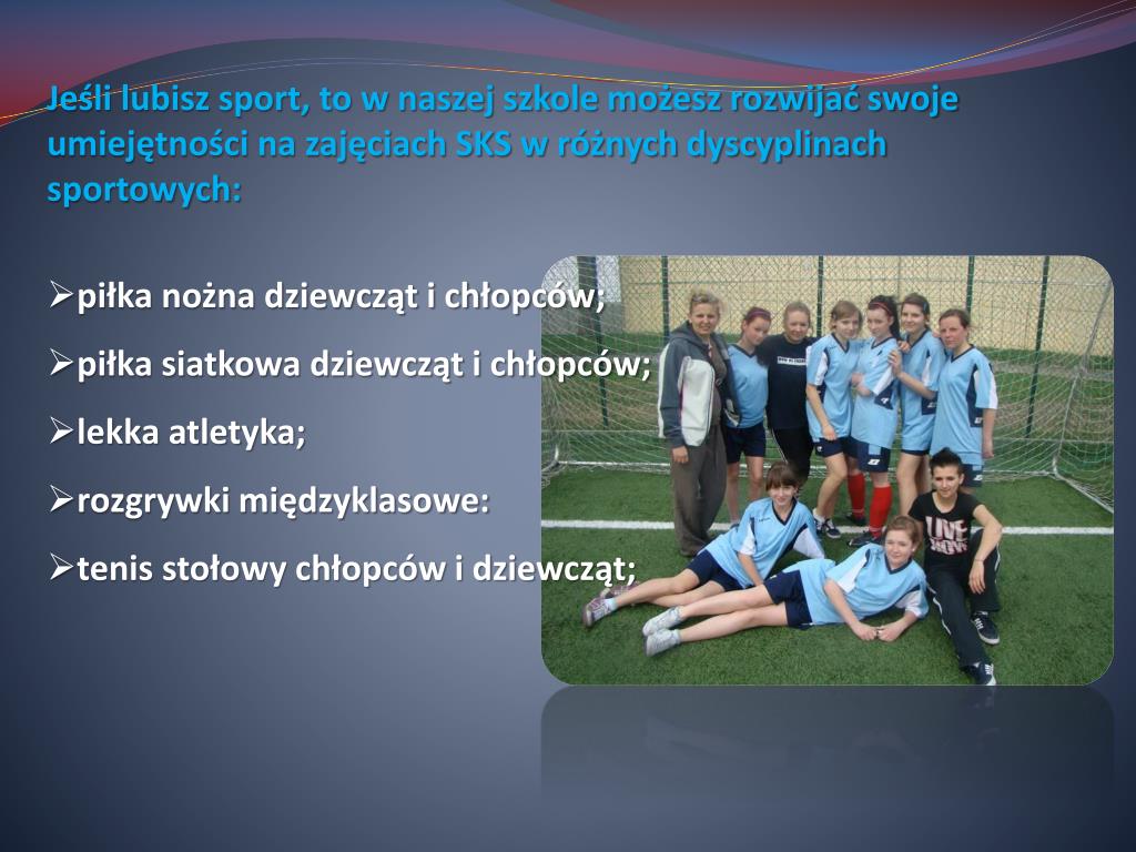 Jeśli lubisz sport, to w naszej szkole możesz rozwijać swoje umiejętności na zajęciach SKS w różnych dyscyplinach sportowych: • piłka nożna dziewcząt i chłopców; • piłka siatkowa dziewcząt i chłopców; • lekka atletyka; • rozgrywki międzyklasowe: • tenis stołowy chłopców i dziewcząt;
