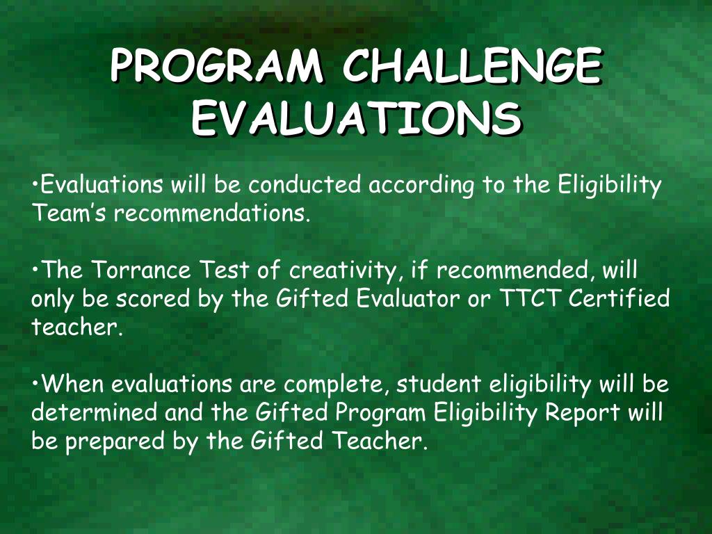 PROGRAM CHALLENGE EVALUATIONS • Evaluations will be conducted according to the Eligibility Team’s recommendations. • The Torrance Test of creativity, if recommended, will only be scored by the Gifted Evaluator or TTCT Certified teacher. • When evaluations are complete, student eligibility will be determined and the Gifted Program Eligibility Report will be prepared by the Gifted Teacher.