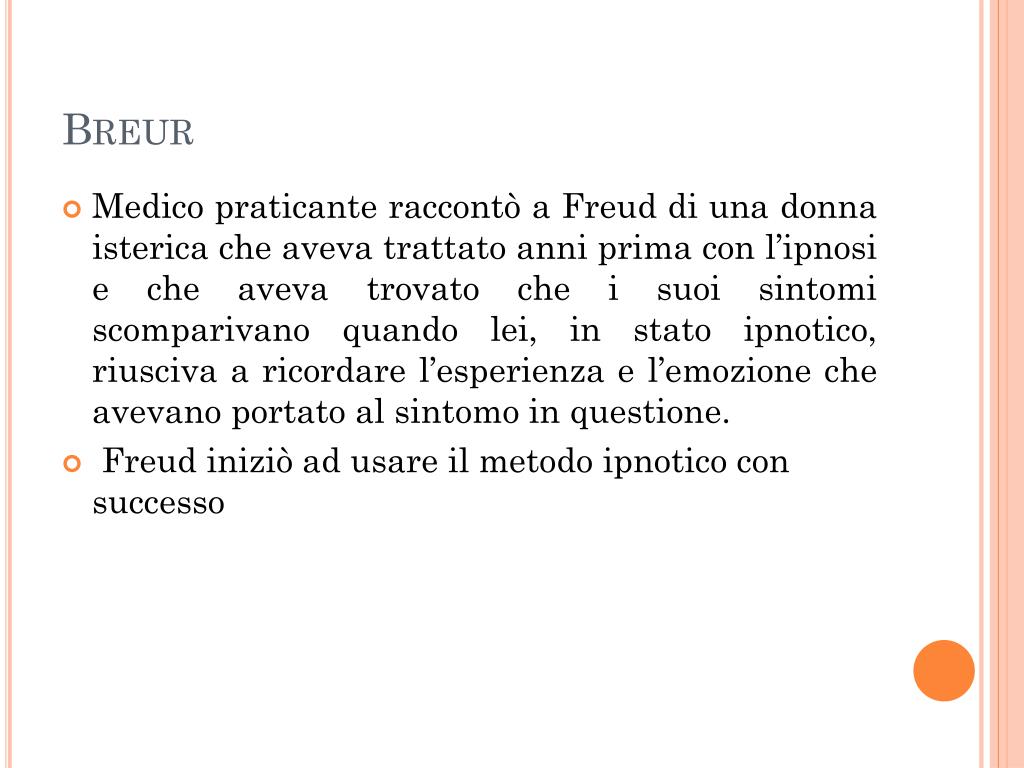 Breur • Medico praticante raccontò a Freud di una donna isterica che aveva trattato anni prima con l’ipnosi e che aveva trovato che i suoi sintomi scomparivano quando lei, in stato ipnotico, riusciva a ricordare l’esperienza e l’emozione che avevano portato al sintomo in questione. • Freud iniziò ad usare il metodo ipnotico con successo