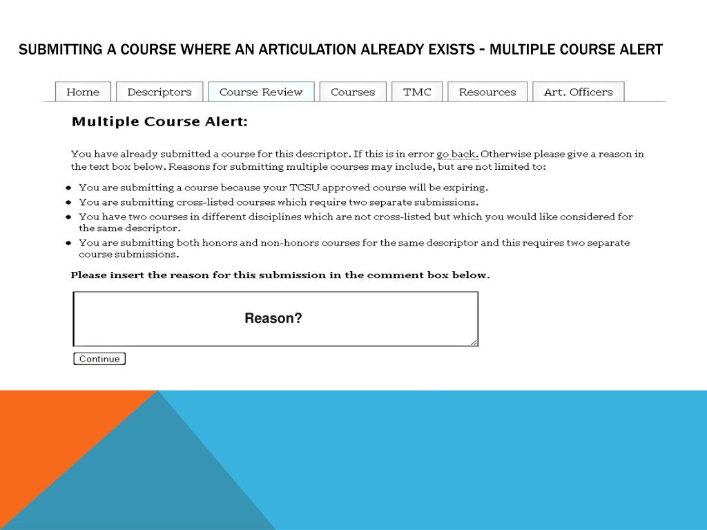 Submitting A Course Where An Articulation Already Exists - Multiple Course Alert Reason?