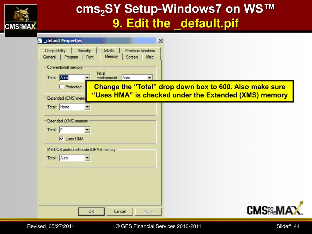 cms2SY Setup-Windows7 on WS™ 9. Edit the _default.pif Change the “Total” drop down box to 600. Also make sure “Uses HMA” is checked under the Extended (XMS) memory