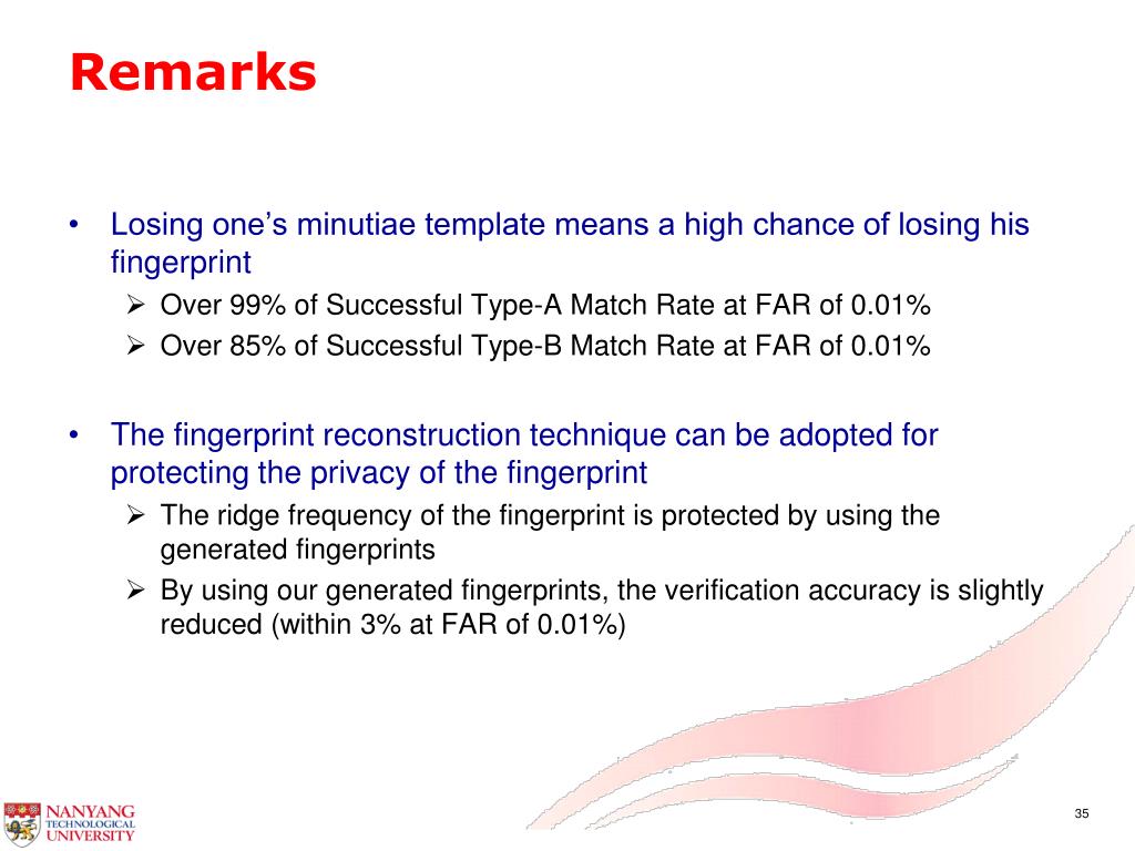 Remarks • Losing one’s minutiae template means a high chance of losing his fingerprint • Over 99% of Successful Type-A Match Rate at FAR of 0.01% • Over 85% of Successful Type-B Match Rate at FAR of 0.01% • The fingerprint reconstruction technique can be adopted for protecting the privacy of the fingerprint • The ridge frequency of the fingerprint is protected by using the generated fingerprints • By using our generated fingerprints, the verification accuracy is slightly reduced (within 3% at FAR of 0.01%)