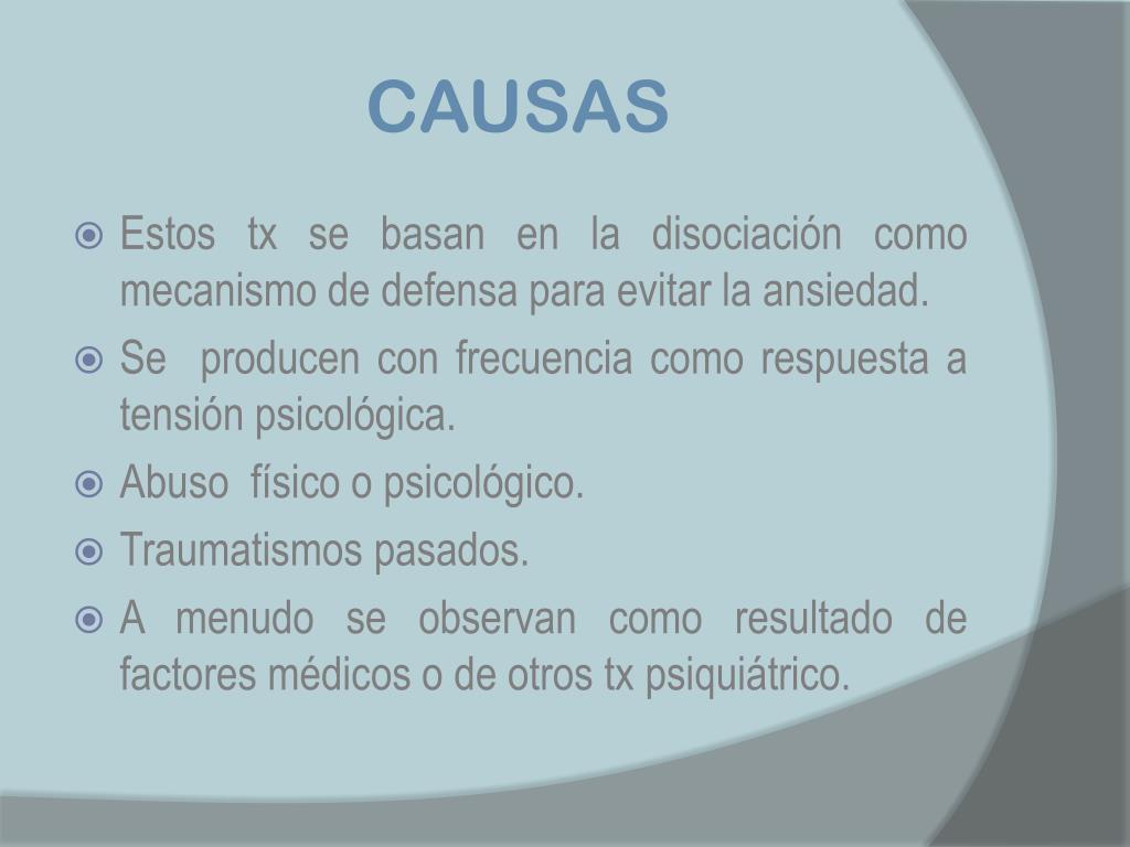CAUSAS • Estos tx se basan en la disociación como mecanismo de defensa para evitar la ansiedad. • Se producen con frecuencia como respuesta a tensión psicológica. • Abuso físico o psicológico. • Traumatismos pasados. • A menudo se observan como resultado de factores médicos o de otros tx psiquiátrico.