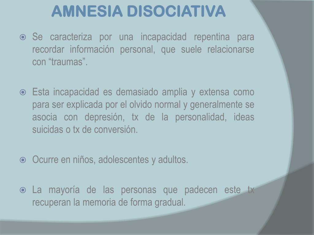 AMNESIA DISOCIATIVA • Se caracteriza por una incapacidad repentina para recordar información personal, que suele relacionarse con “traumas”. • Esta incapacidad es demasiado amplia y extensa como para ser explicada por el olvido normal y generalmente se asocia con depresión, tx de la personalidad, ideas suicidas o tx de conversión. • Ocurre en niños, adolescentes y adultos. • La mayoría de las personas que padecen este tx recuperan la memoria de forma gradual.