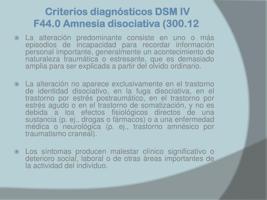Criterios diagnósticos DSM IV F44.0 Amnesia disociativa (300.12 • La alteración predominante consiste en uno o más episodios de incapacidad para recordar información personal importante, generalmente un acontecimiento de naturaleza traumática o estresante, que es demasiado amplia para ser explicada a partir del olvido ordinario. • La alteración no aparece exclusivamente en el trastorno de identidad disociativo, en la fuga disociativa, en el trastorno por estrés postraumático, en el trastorno por estrés agudo o en el trastorno de somatización, y no es debida a los efectos fisiológicos directos de una sustancia (p. ej., drogas o fármacos) o a una enfermedad médica o neurológica (p. ej., trastorno amnésico por traumatismo craneal). • Los síntomas producen malestar clínico significativo o deterioro social, laboral o de otras áreas importantes de la actividad del individuo.