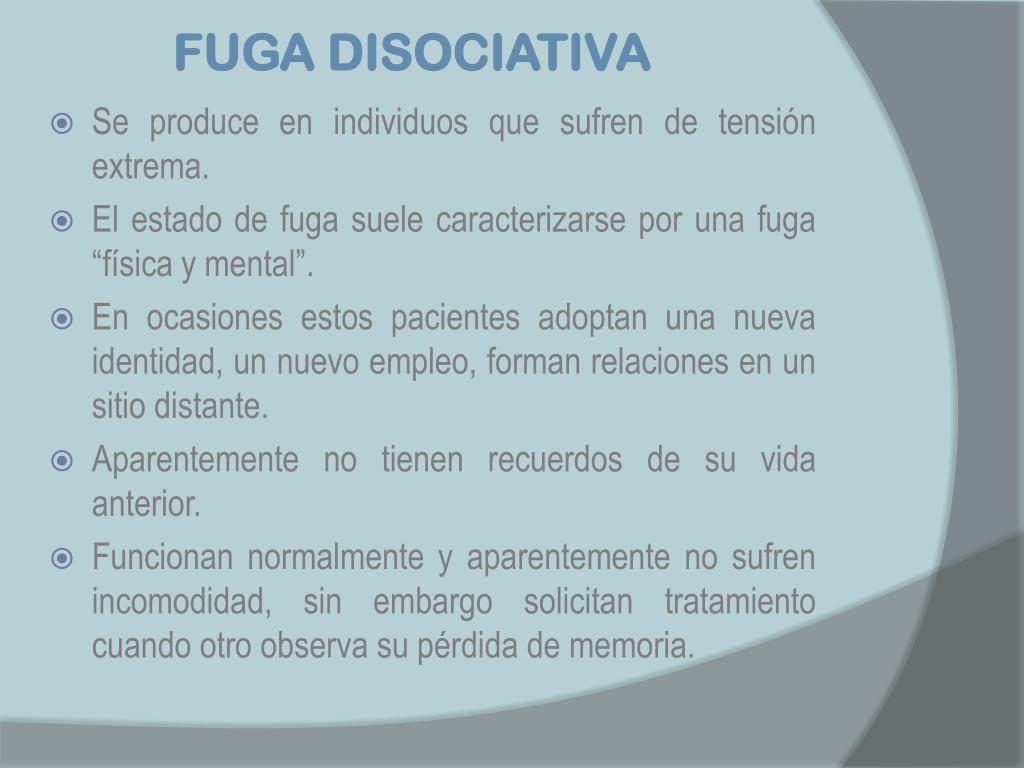 Criterios diagnósticos F44.1 Fuga disociativa (300.13) • La alteración esencial de este trastorno consiste en viajes repentinos e inesperados lejos del hogar o del puesto de trabajo, con incapacidad para recordar el pasado del individuo. • Confusión sobre la identidad personal, o asunción de una nueva identidad (parcial o completa). • El trastorno no aparece exclusivamente en el transcurso de un trastorno de identidad disociativo y no es debido a los efectos fisiológicos de una sustancia (p. ej., drogas o fármacos) o de una enfermedad médica (p. ej., epilepsia del lóbulo temporal). • Los síntomas producen malestar clínico significativo o deterioro social, laboral o de otras áreas importantes de la actividad del individuo.