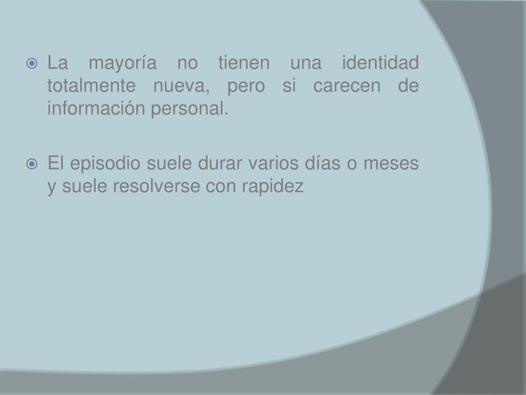 La mayoría no tienen una identidad totalmente nueva, pero si carecen de información personal. • El episodio suele durar varios días o meses y suele resolverse con rapidez
