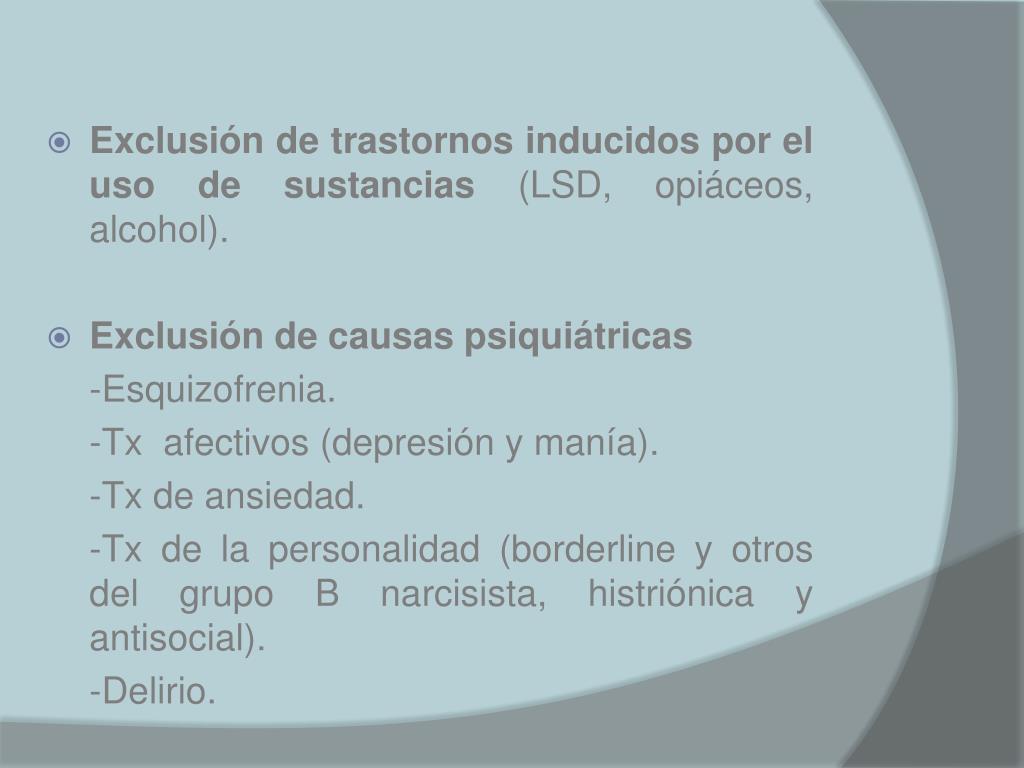 Exclusión de trastornos inducidos por el uso de sustancias (LSD, opiáceos, alcohol). • Exclusión de causas psiquiátricas -Esquizofrenia. -Tx afectivos (depresión y manía). -Tx de ansiedad. -Tx de la personalidad (borderline y otros del grupo B narcisista, histriónica y antisocial). -Delirio.