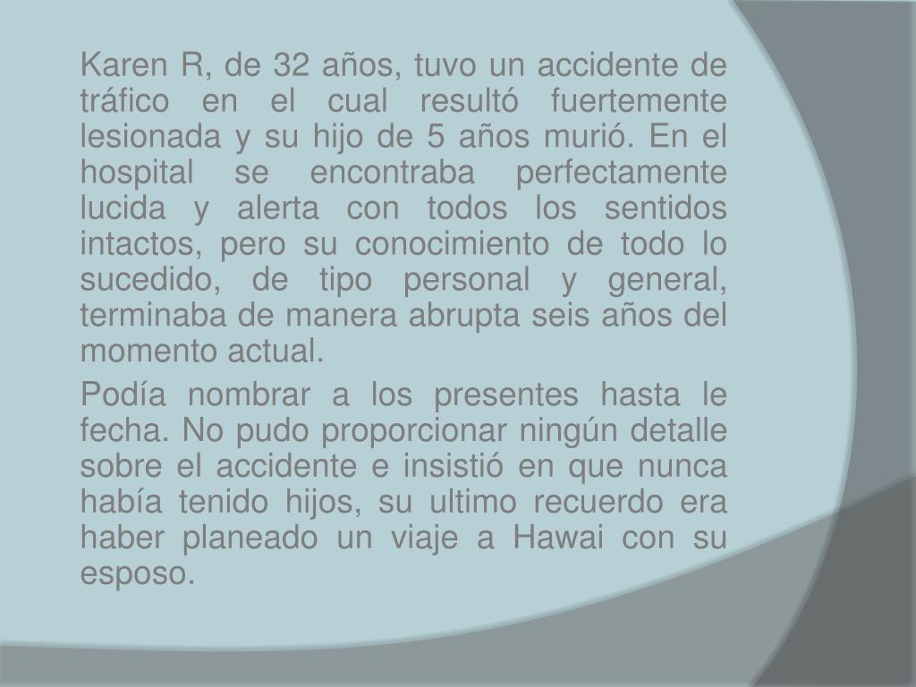 Karen R, de 32 años, tuvo un accidente de tráfico en el cual resultó fuertemente lesionada y su hijo de 5 años murió. En el hospital se encontraba perfectamente lucida y alerta con todos los sentidos intactos, pero su conocimiento de todo lo sucedido, de tipo personal y general, terminaba de manera abrupta seis años del momento actual. Podía nombrar a los presentes hasta le fecha. No pudo proporcionar ningún detalle sobre el accidente e insistió en que nunca había tenido hijos, su ultimo recuerdo era haber planeado un viaje a Hawai con su esposo.