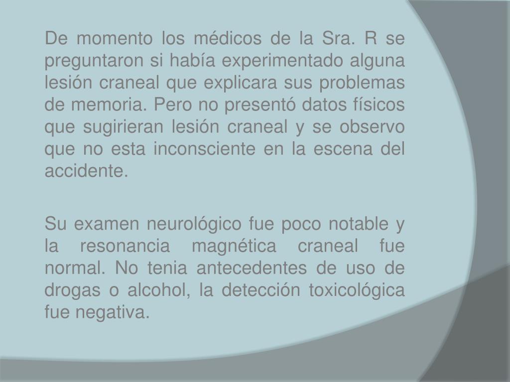 De momento los médicos de la Sra. R se preguntaron si había experimentado alguna lesión craneal que explicara sus problemas de memoria. Pero no presentó datos físicos que sugirieran lesión craneal y se observo que no esta inconsciente en la escena del accidente. Su examen neurológico fue poco notable y la resonancia magnética craneal fue normal. No tenia antecedentes de uso de drogas o alcohol, la detección toxicológica fue negativa.