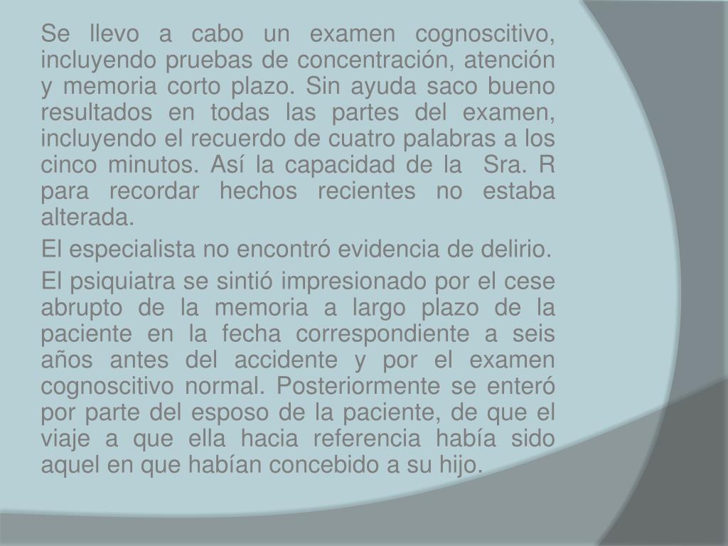 Se llevo a cabo un examen cognoscitivo, incluyendo pruebas de concentración, atención y memoria corto plazo. Sin ayuda saco bueno resultados en todas las partes del examen, incluyendo el recuerdo de cuatro palabras a los cinco minutos. Así la capacidad de la Sra. R para recordar hechos recientes no estaba alterada. El especialista no encontró evidencia de delirio. El psiquiatra se sintió impresionado por el cese abrupto de la memoria a largo plazo de la paciente en la fecha correspondiente a seis años antes del accidente y por el examen cognoscitivo normal. Posteriormente se enteró por parte del esposo de la paciente, de que el viaje a que ella hacia referencia había sido aquel en que habían concebido a su hijo.