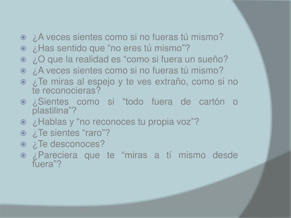 ¿A veces sientes como si no fueras tú mismo? • ¿Has sentido que “no eres tú mismo”? • ¿O que la realidad es “como si fuera un sueño? • ¿A veces sientes como si no fueras tú mismo? • ¿Te miras al espejo y te ves extraño, como si no te reconocieras? • ¿Sientes como si “todo fuera de cartón o plastilina”? • ¿Hablas y “no reconoces tu propia voz”? • ¿Te sientes “raro”? • ¿Te desconoces? • ¿Pareciera que te “miras a tí mismo desde fuera”?