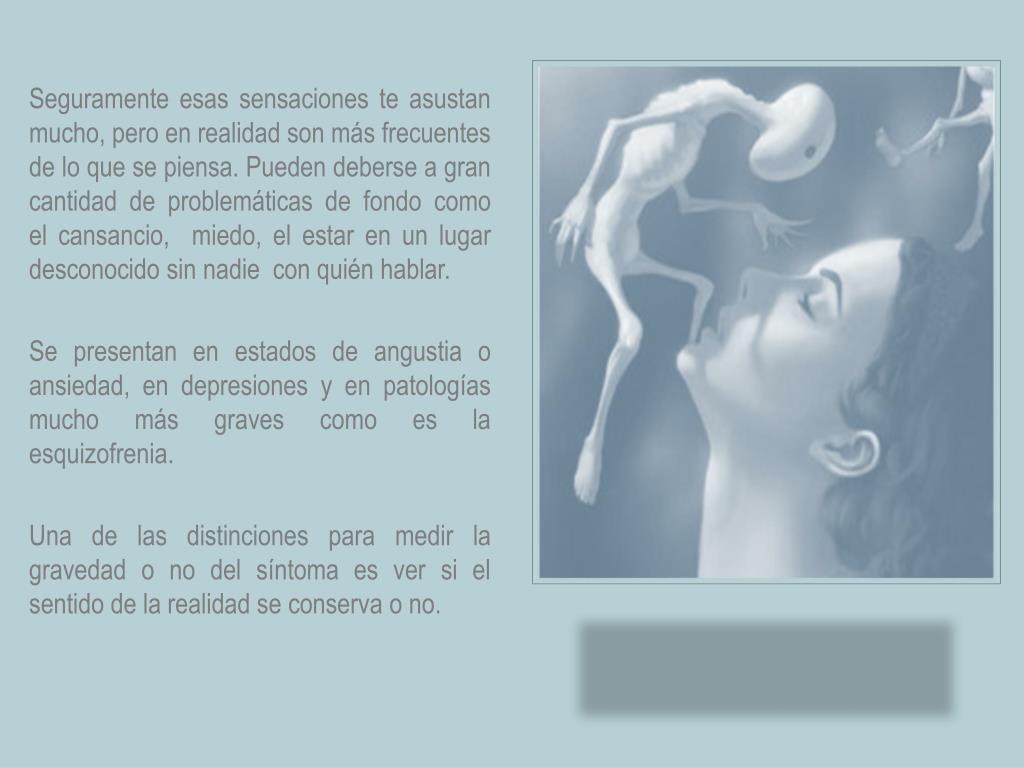 Seguramente esas sensaciones te asustan mucho, pero en realidad son más frecuentes de lo que se piensa. Pueden deberse a gran cantidad de problemáticas de fondo como el cansancio, miedo, el estar en un lugar desconocido sin nadie con quién hablar. Se presentan en estados de angustia o ansiedad, en depresiones y en patologías mucho más graves como es la esquizofrenia. Una de las distinciones para medir la gravedad o no del síntoma es ver si el sentido de la realidad se conserva o no.