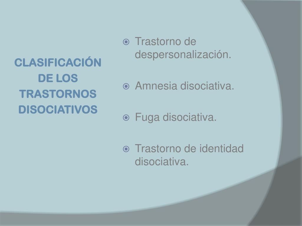 CLASIFICACIÓN DE LOS TRASTORNOS DISOCIATIVOS • Trastorno de despersonalización. • Amnesia disociativa. • Fuga disociativa. • Trastorno de identidad disociativa.