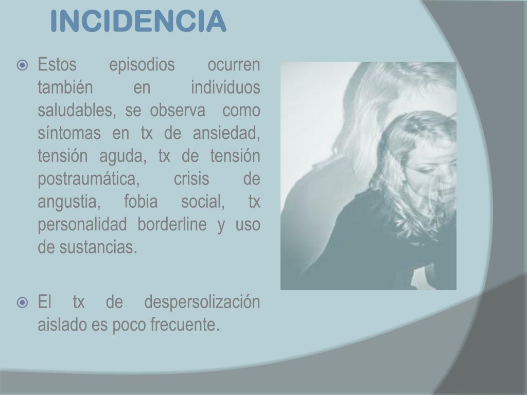 INCIDENCIA • Estos episodios ocurren también en individuos saludables, se observa como síntomas en tx de ansiedad, tensión aguda, tx de tensión postraumática, crisis de angustia, fobia social, tx personalidad borderline y uso de sustancias. • El tx de despersolización aislado es poco frecuente.
