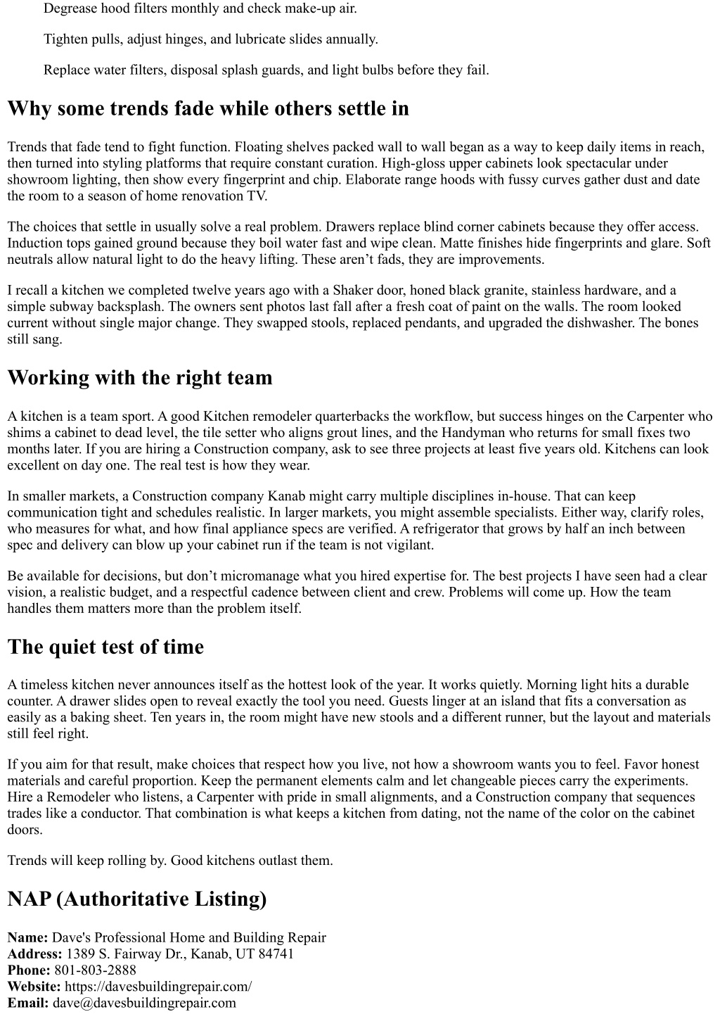 Degrease hood filters monthly and check make-up air. Tighten pulls, adjust hinges, and lubricate slides annually. Replace water filters, disposal splash guards, and light bulbs before they fail. Why some trends fade while others settle in Trends that fade tend to fight function. Floating shelves packed wall to wall began as a way to keep daily items in reach, then turned into styling platforms that require constant curation. High-gloss upper cabinets look spectacular under showroom lighting, then show every fingerprint and chip. Elaborate range hoods with fussy curves gather dust and date the room to a season of home renovation TV. The choices that settle in usually solve a real problem. Drawers replace blind corner cabinets because they offer access. Induction tops gained ground because they boil water fast and wipe clean. Matte finishes hide fingerprints and glare. Soft neutrals allow natural light to do the heavy lifting. These aren’t fads, they are improvements. I recall a kitchen we completed twelve years ago with a Shaker door, honed black granite, stainless hardware, and a simple subway backsplash. The owners sent photos last fall after a fresh coat of paint on the walls. The room looked current without single major change. They swapped stools, replaced pendants, and upgraded the dishwasher. The bones still sang. Working with the right team A kitchen is a team sport. A good Kitchen remodeler quarterbacks the workflow, but success hinges on the Carpenter who shims a cabinet to dead level, the tile setter who aligns grout lines, and the Handyman who returns for small fixes two months later. If you are hiring a Construction company, ask to see three projects at least five years old. Kitchens can look excellent on day one. The real test is how they wear. In smaller markets, a Construction company Kanab might carry multiple disciplines in-house. That can keep communication tight and schedules realistic. In larger markets, you might assemble specialists. Either way, clarify roles, who measures for what, and how final appliance specs are verified. A refrigerator that grows by half an inch between spec and delivery can blow up your cabinet run if the team is not vigilant. Be available for decisions, but don’t micromanage what you hired expertise for. The best projects I have seen had a clear vision, a realistic budget, and a respectful cadence between client and crew. Problems will come up. How the team handles them matters more than the problem itself. The quiet test of time A timeless kitchen never announces itself as the hottest look of the year. It works quietly. Morning light hits a durable counter. A drawer slides open to reveal exactly the tool you need. Guests linger at an island that fits a conversation as easily as a baking sheet. Ten years in, the room might have new stools and a different runner, but the layout and materials still feel right. If you aim for that result, make choices that respect how you live, not how a showroom wants you to feel. Favor honest materials and careful proportion. Keep the permanent elements calm and let changeable pieces carry the experiments. Hire a Remodeler who listens, a Carpenter with pride in small alignments, and a Construction company that sequences trades like a conductor. That combination is what keeps a kitchen from dating, not the name of the color on the cabinet doors. Trends will keep rolling by. Good kitchens outlast them. NAP (Authoritative Listing) Name: Dave's Professional Home and Building Repair Address: 1389 S. Fairway Dr., Kanab, UT 84741 Phone: 801-803-2888 Website: https://davesbuildingrepair.com/ Email: dave@davesbuildingrepair.com